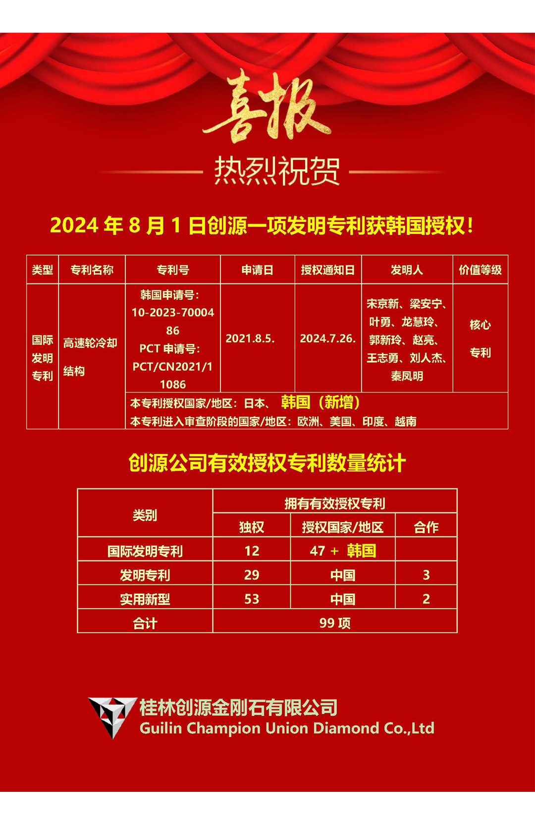 2024年8月1日创源一项发明专利获韩国授权!