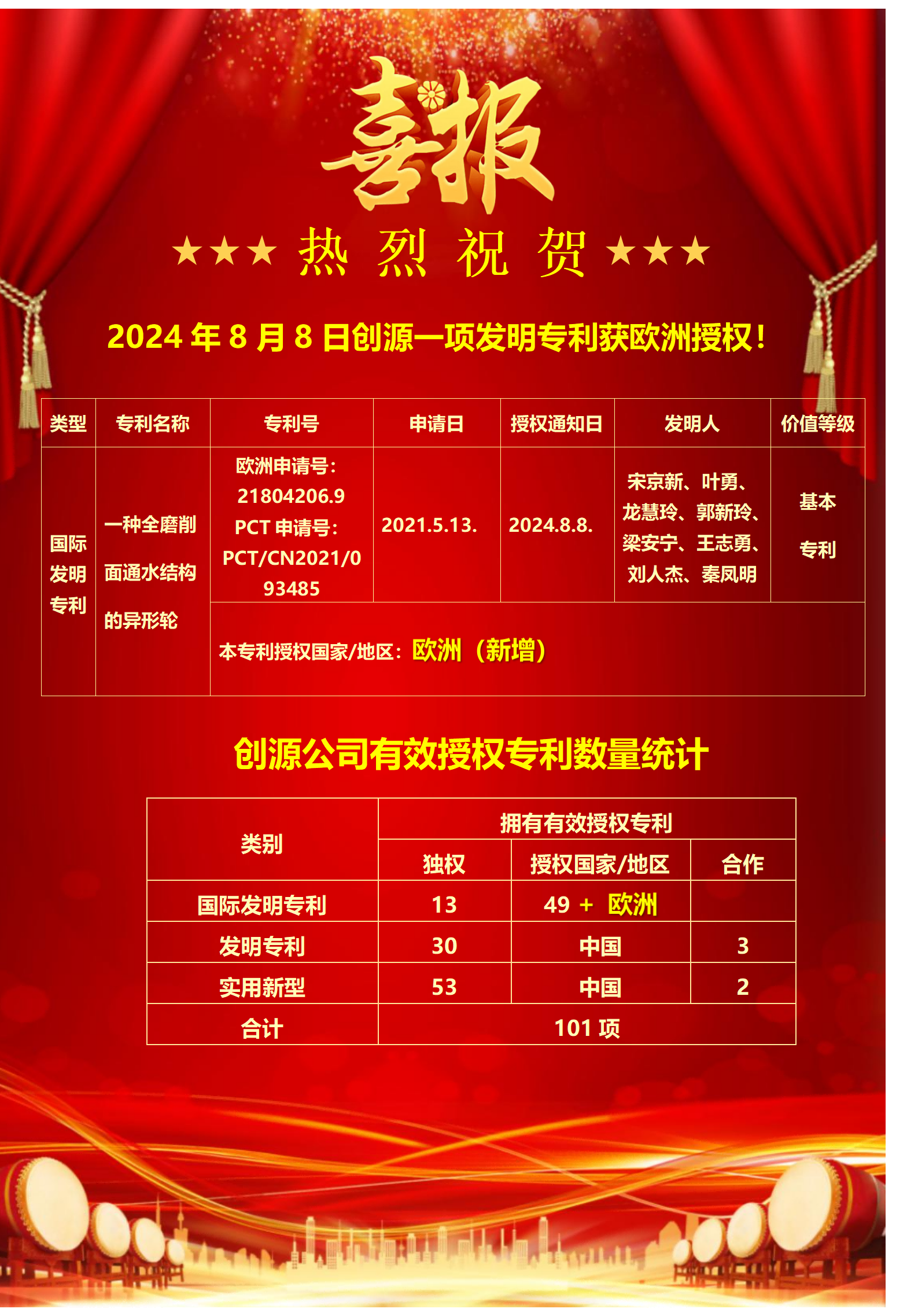 2024年8月8日创源一项发明专利获欧洲授权