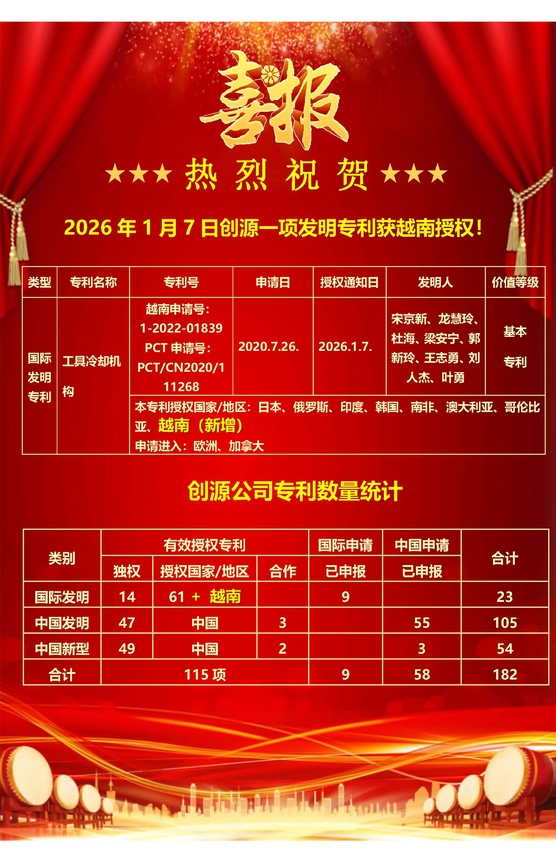 2026年1月7日创源一项发明专利获越南授权